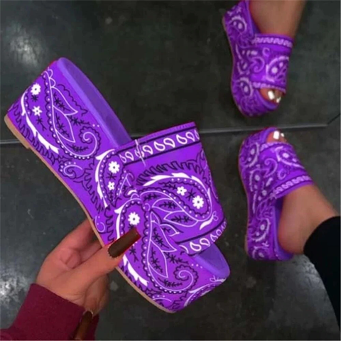 Sandalias planas con plataforma de cuña para mujer, zapatillas de tela estampada, cómodas, para playa